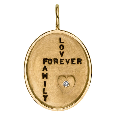 Medium yellow gold oval charm with a yellow gold frame, yellow gold raised heart, and a 1.5mm white diamond in the center. Hand stamped with "Love Forever Family" in a crossword layout.
