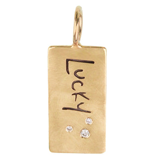 Mini yellow gold ID tag with two 1mm white diamonds and one 1.5mm white diamond. Hand stamped with "Lucky"