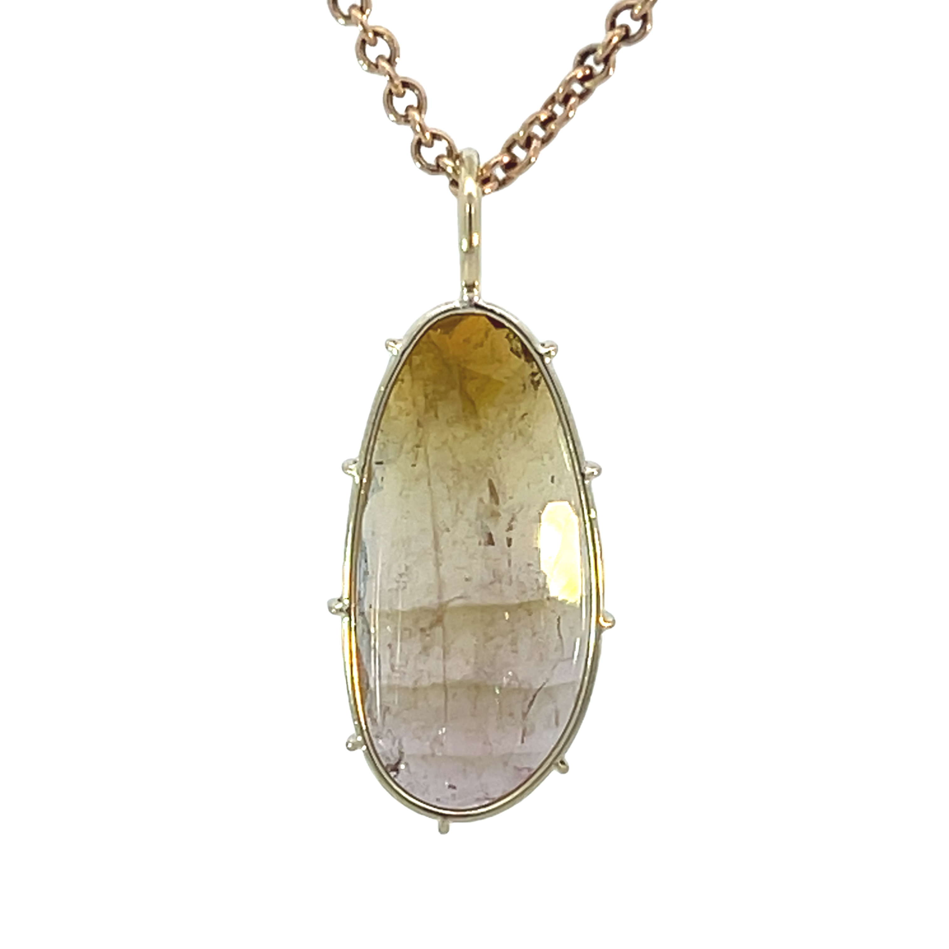 Medium multicolored tourmaline Harriet Stone wrapped in green gold wire. The stone shown is the stone you will receive. Each Harriet Stone is unique, and once this stone is sold there may not be another like it.