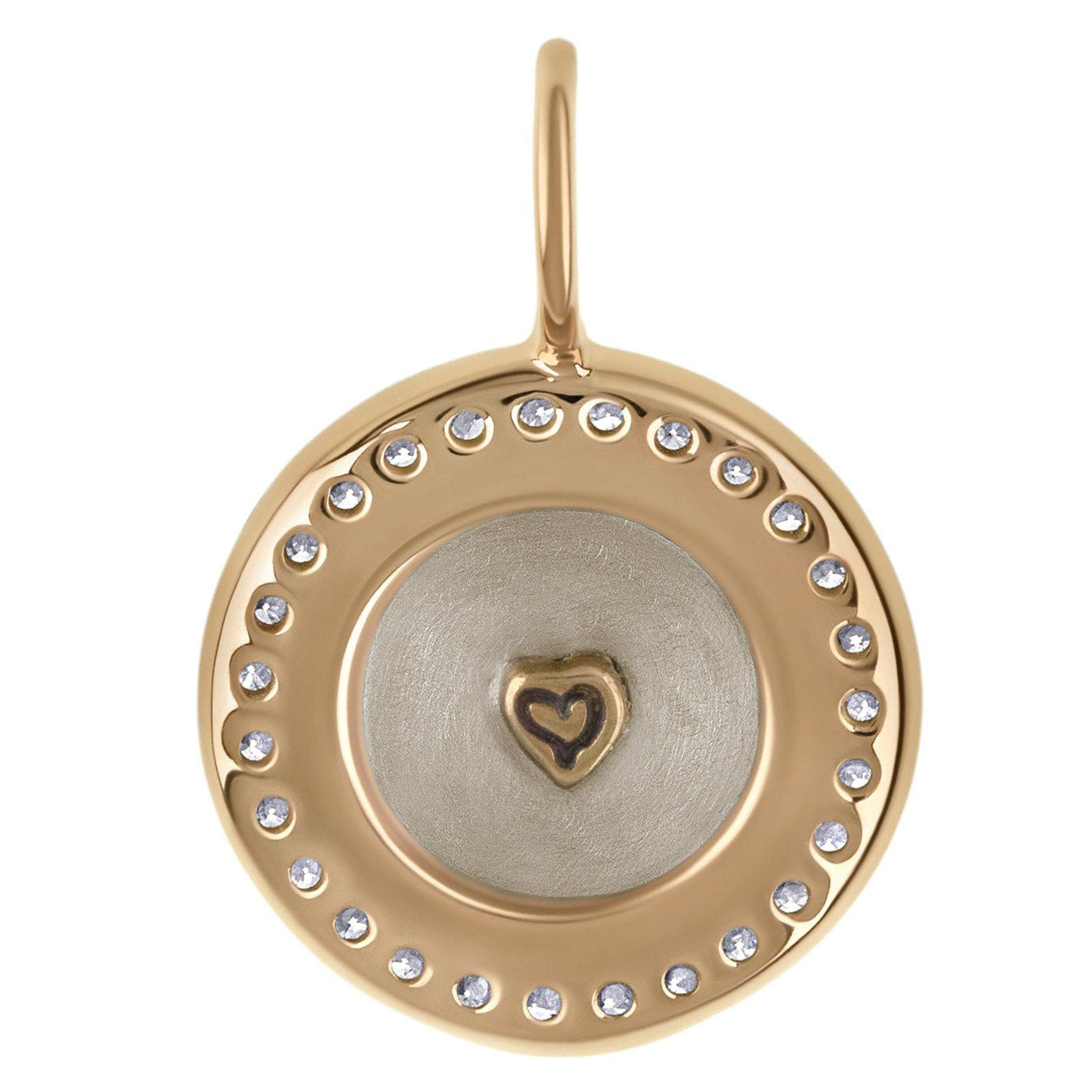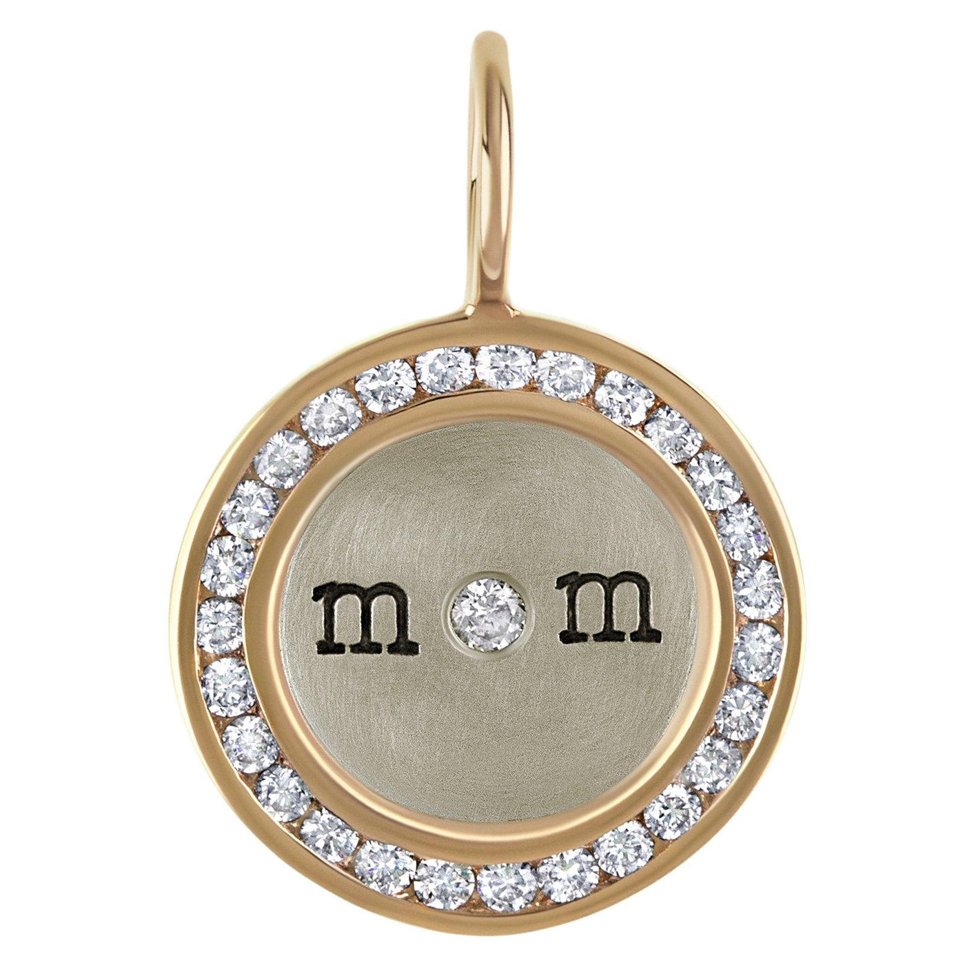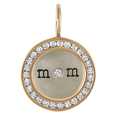 Mini white gold round charm with a yellow gold channel set frame with white diamonds, a 2mm white diamond on the front and a stamped raised yellow gold heart on the back. Hand stamped with “Mom” with a diamond for the “O”