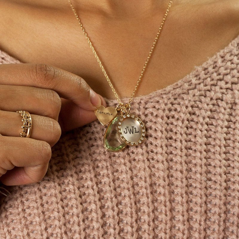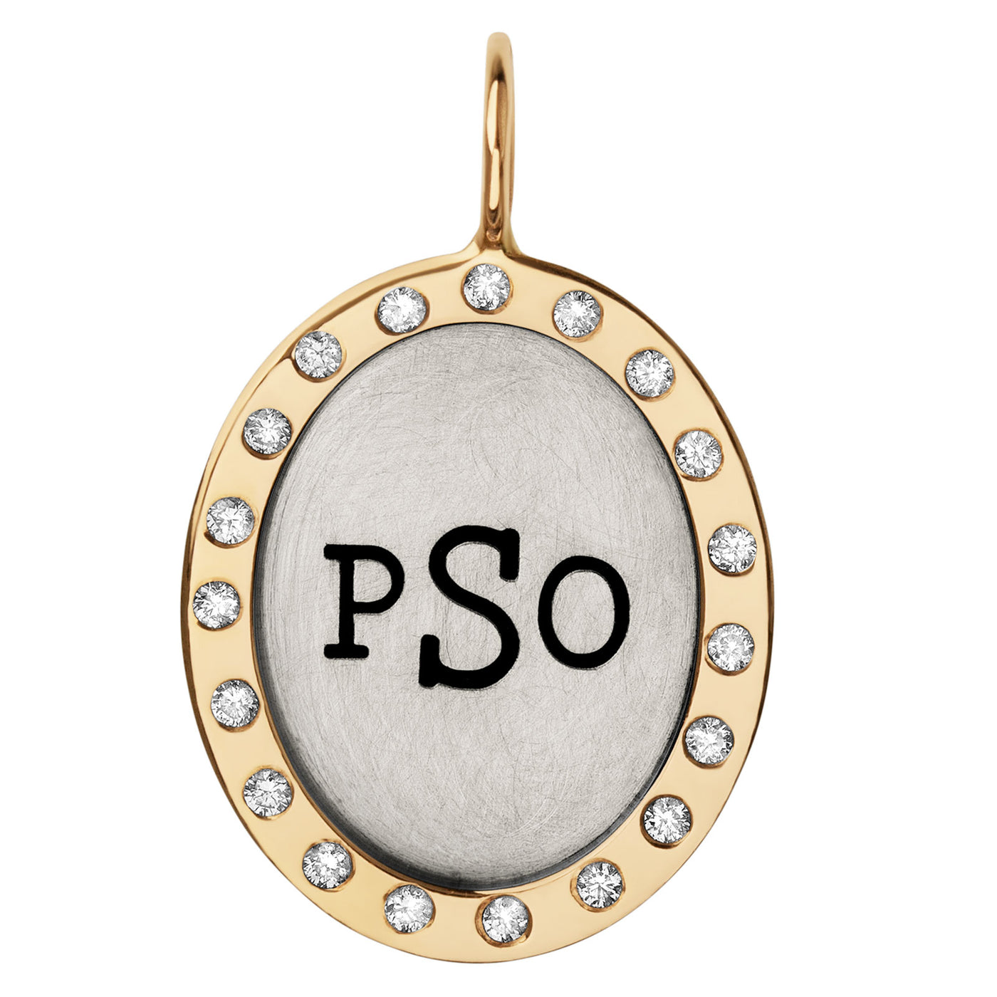 This delicate monogram oval charm offers the perfect balance of classiness and elegance. Our yellow gold frame makes your hand-stamped monogram the focal point. This oval charm sparkles beautifully, with 19 white diamonds perfectly blending around the edge. Wear this oval charm as the ideal accessory for any outfit, or mix and match it with any of our other keepsakes. Heather B. Moores' personalized oval charms are the perfect gift for any occasion. Please contact us for more information on how to customize your oval pendant.