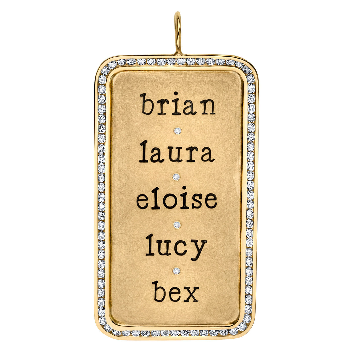 Beautifully crafted with love, this solid 14k yellow gold ID tag is the perfect way to cherish the bond between your loved ones. It's surrounded by a yellow gold channel set frame with white diamonds and can be personalized with a set of names. Make a lasting impression with this timeless and stunning piece of art.