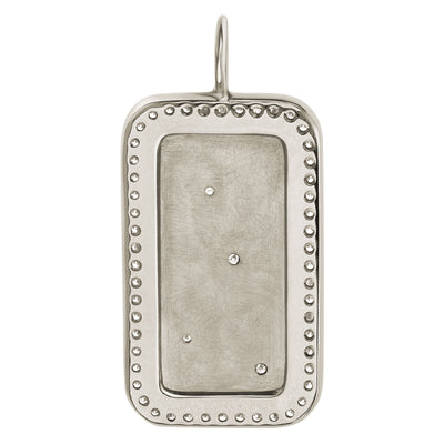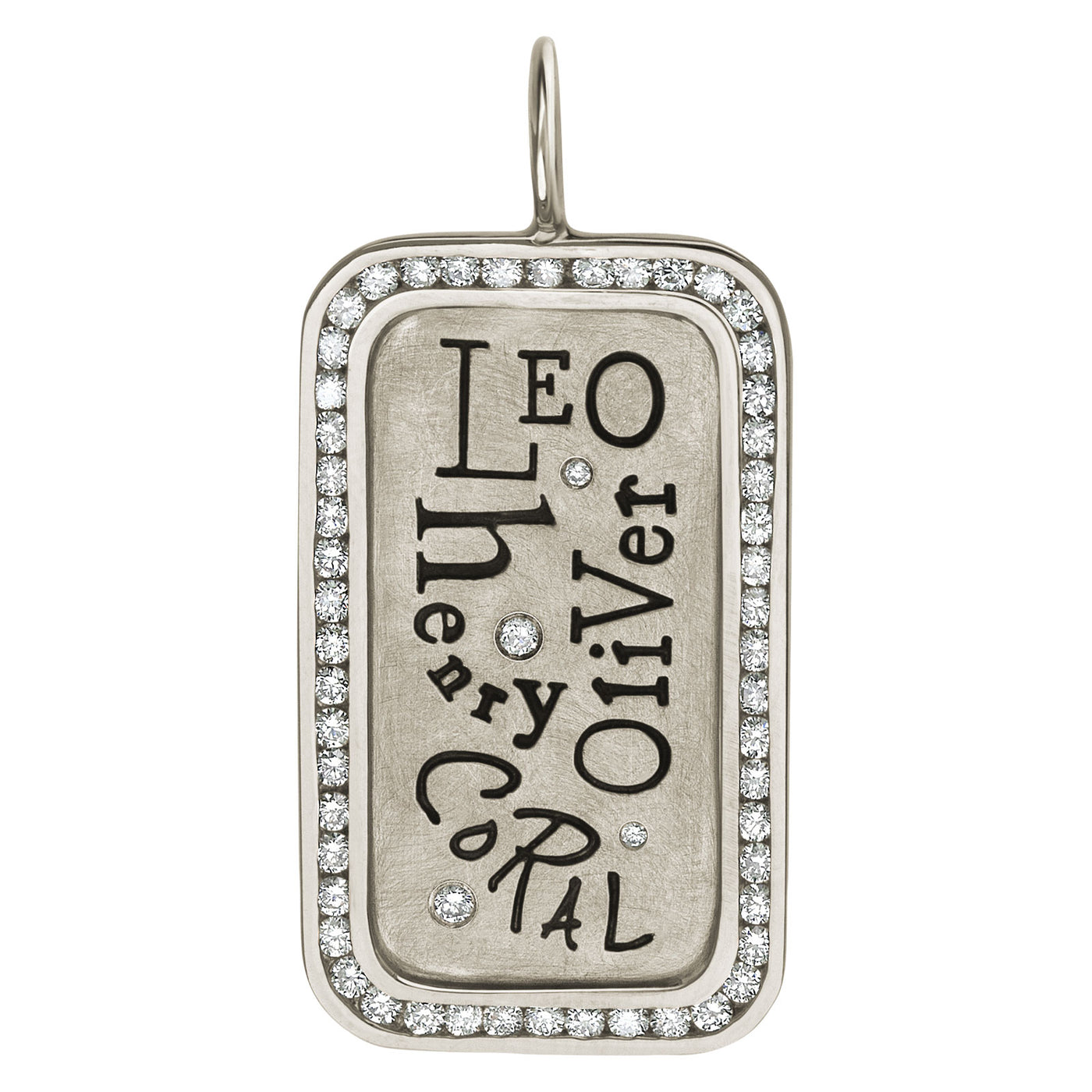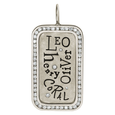 Small white gold ID Tag with a white gold channel set frame with white diamonds and a scatter of two 1mm and two 1.5mm white diamonds. Hand stamped with multiple names in a puzzle graffiti layout.