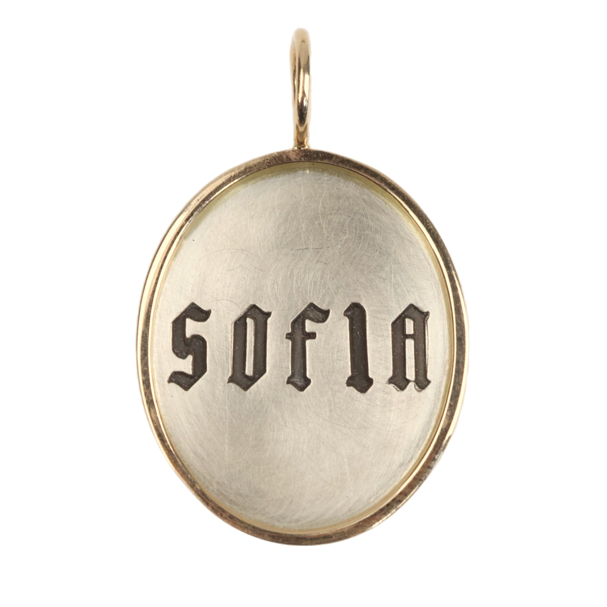 Medium silver oval charms with a yellow gold frame. Hand stamped with a name in our brand new bold Renaissance font.