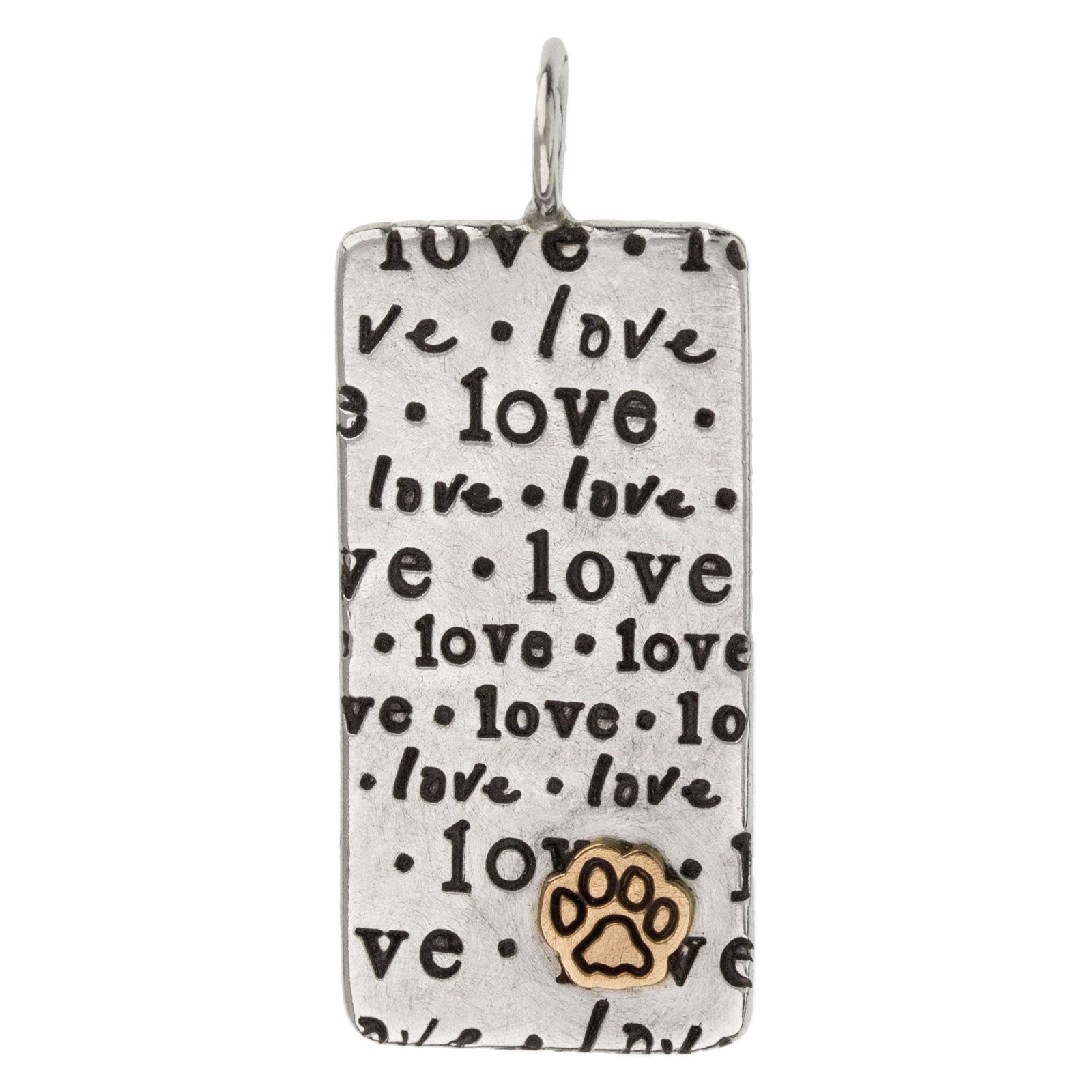 Medium silver ID tag with a yellow gold stamped raised paw. Hand stamped with "love" on repeat.