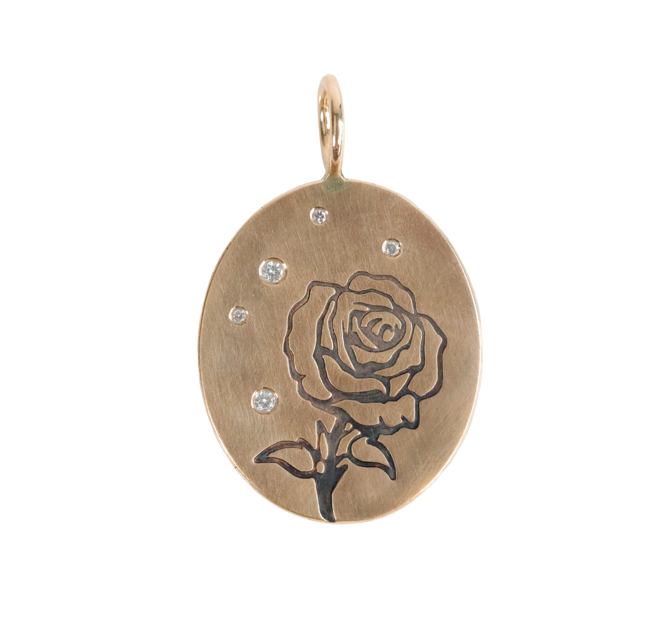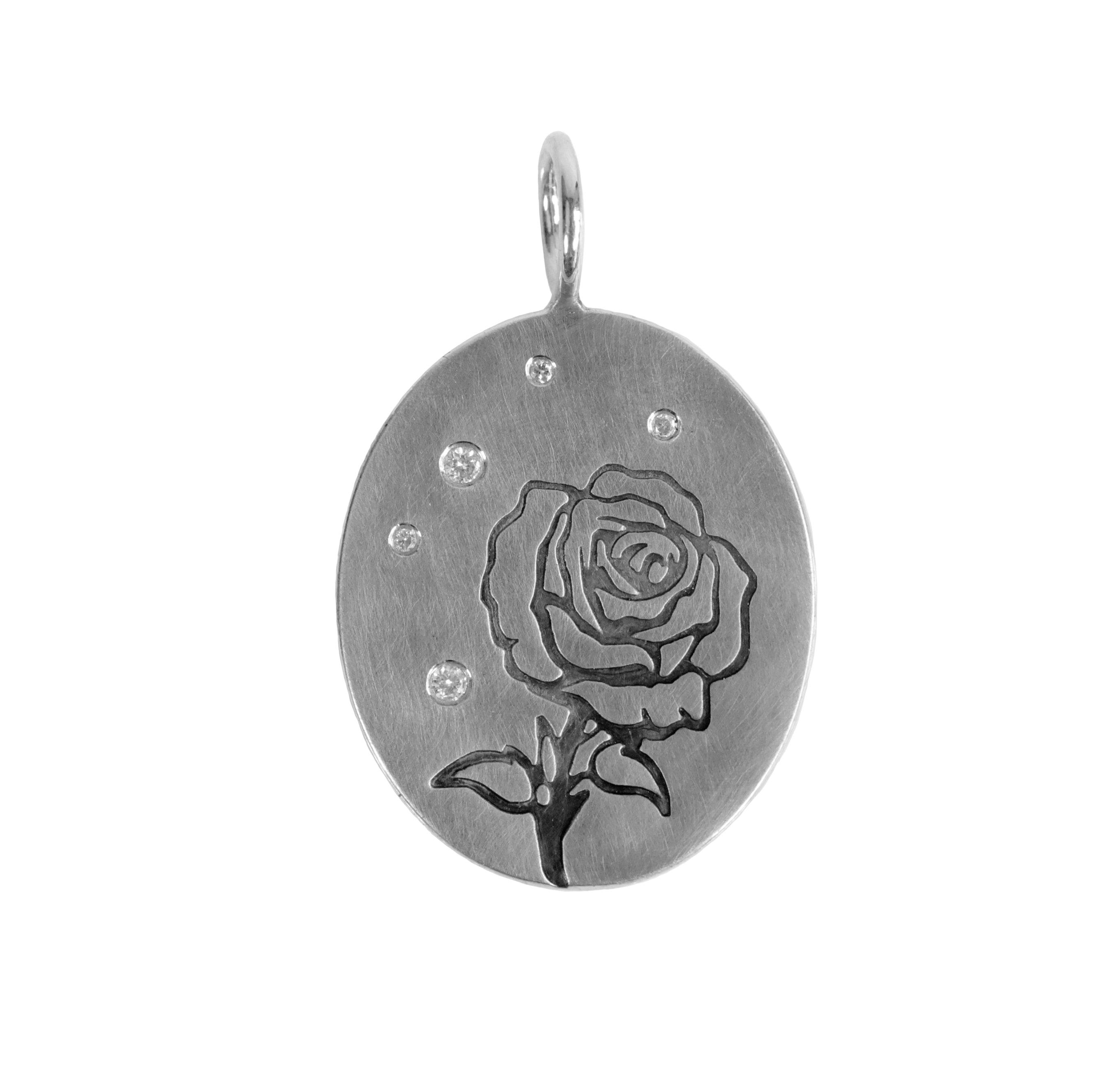 This charming oval charm is a celebration of springtime and nature. Hand-stamped with a beautiful rose, and accented with a sparkling cluster of white diamonds. Crafted from either 14k yellow gold or sterling silver, it exudes a sense of luxury and elegance that will add a touch of nature-inspired beauty to any outfit.