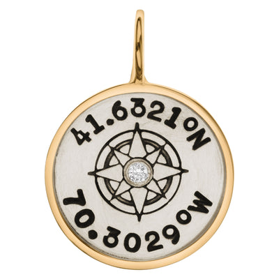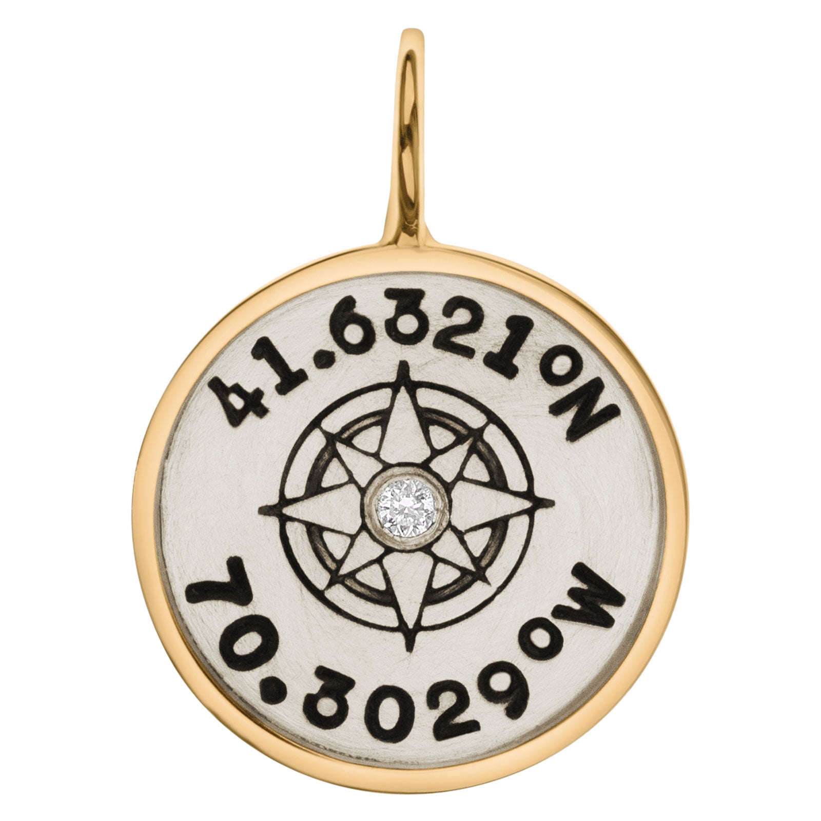 A symbol of a meaningful place in your life, this one-of-a-kind charm is handcrafted from silver and 14k yellow gold, and inset with a dazzling white diamond. Personalize it with your own coordinates to truly make it your own. Where will your story start?
