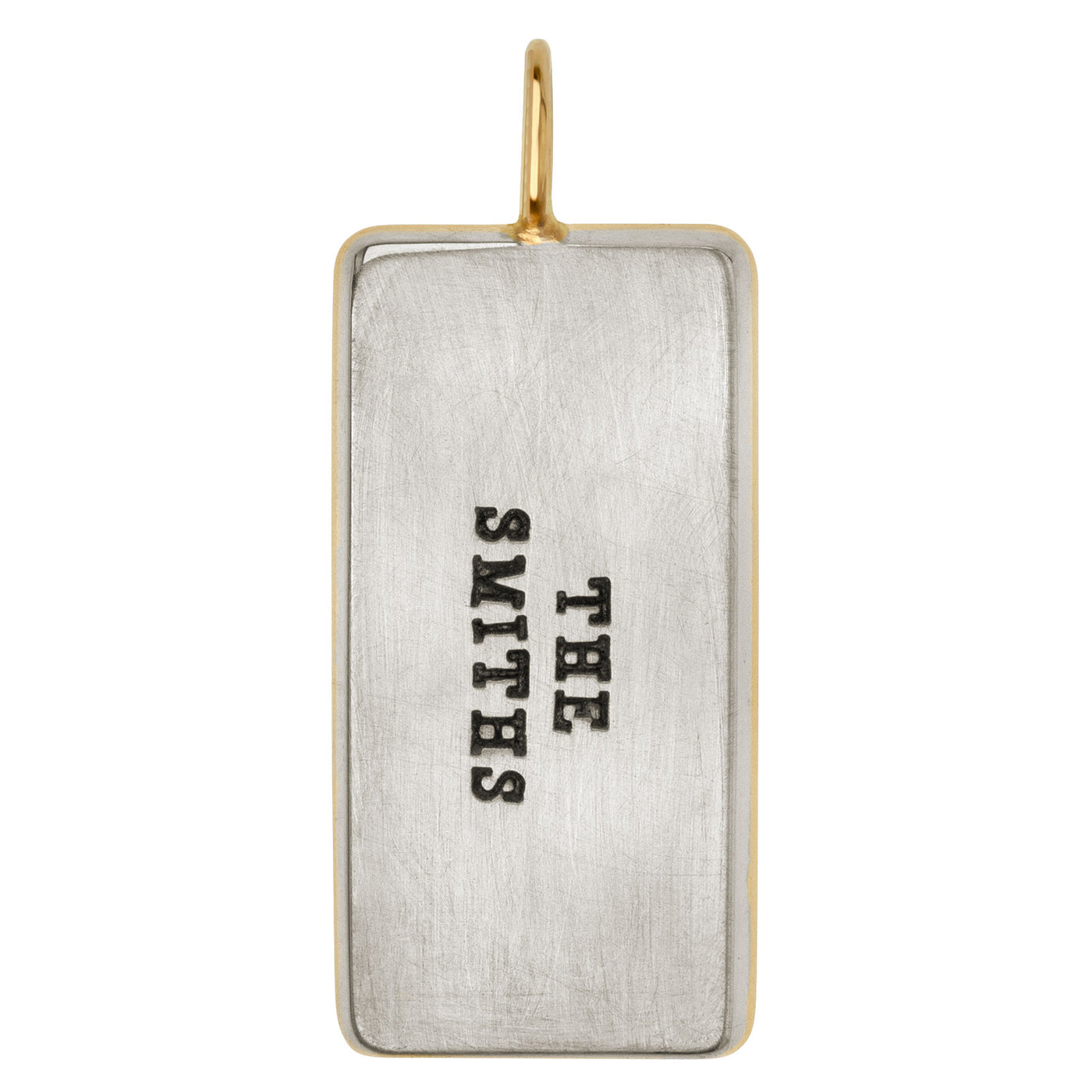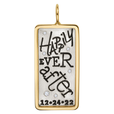Medium silver ID tag with five 1mm white diamonds and a 1.5mm white diamond. Hand stamped with "Happily Ever After", a date and the last name on the back.