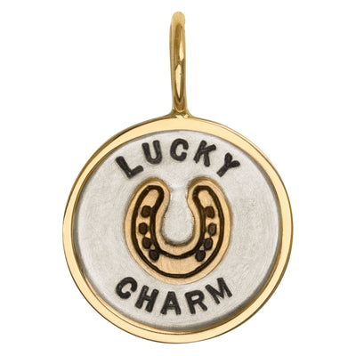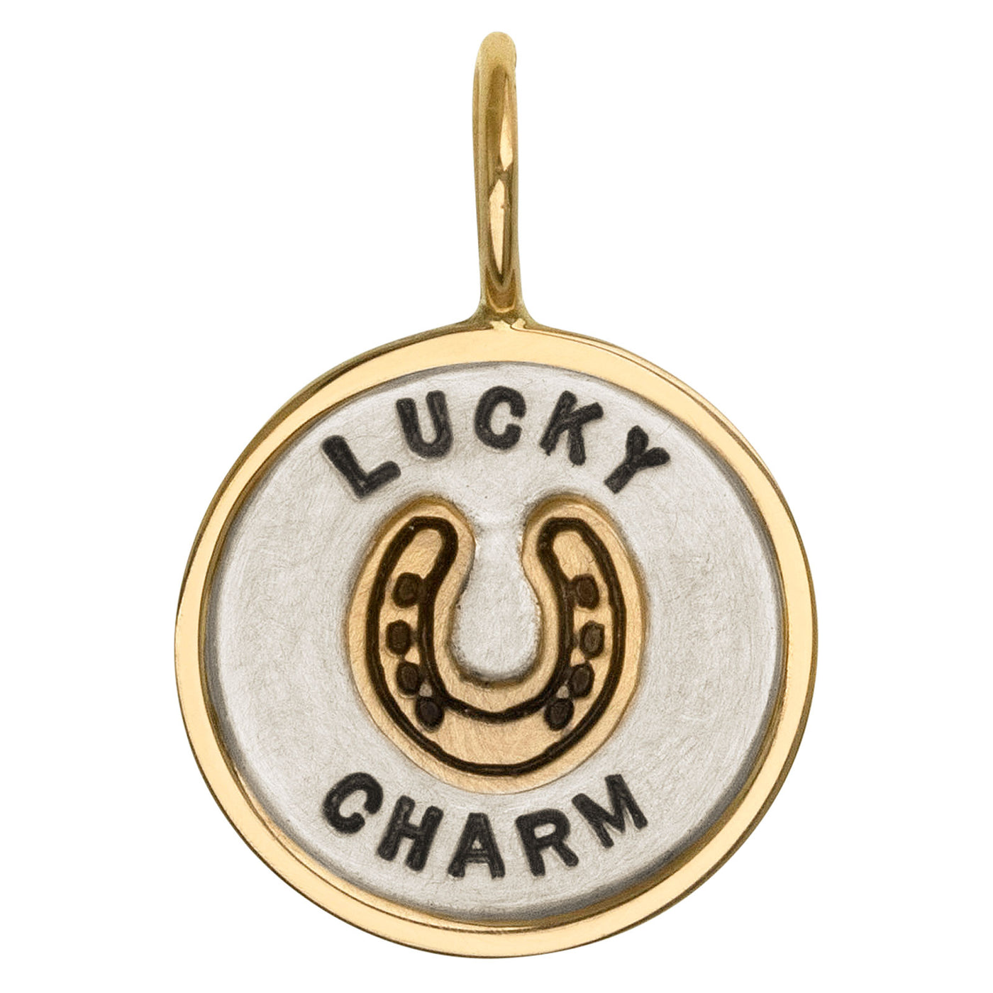 Small silver round charm with a yellow gold frame. Hand stamped with "Lucky Charm" and a yellow gold stamped raised horseshoe.