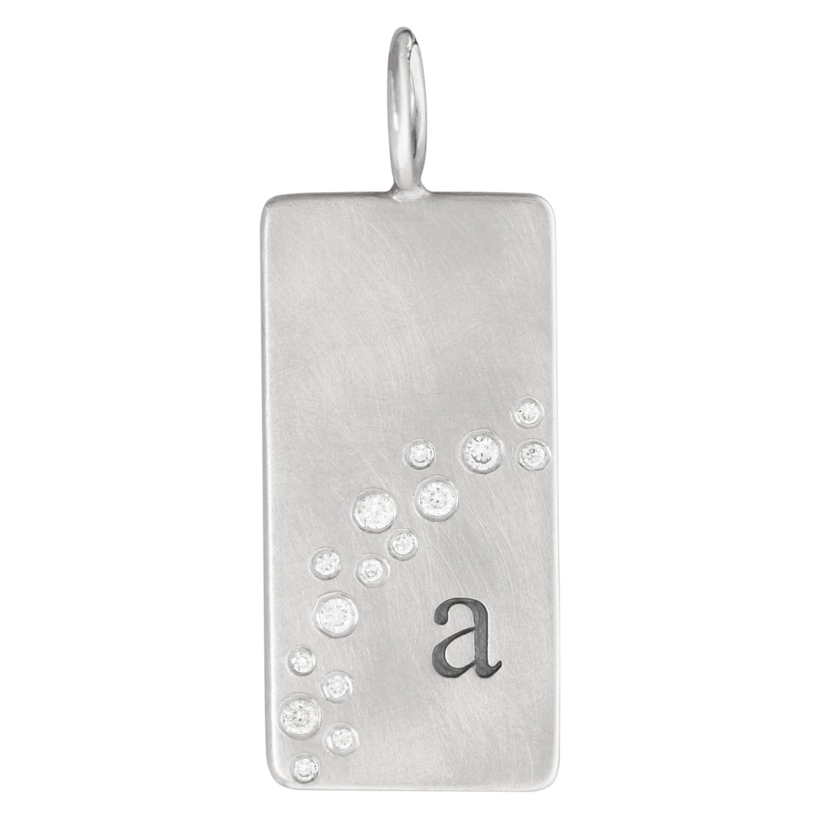 Small silver ID tag with a waterfall of white diamonds. Hand stamped with a single initial.