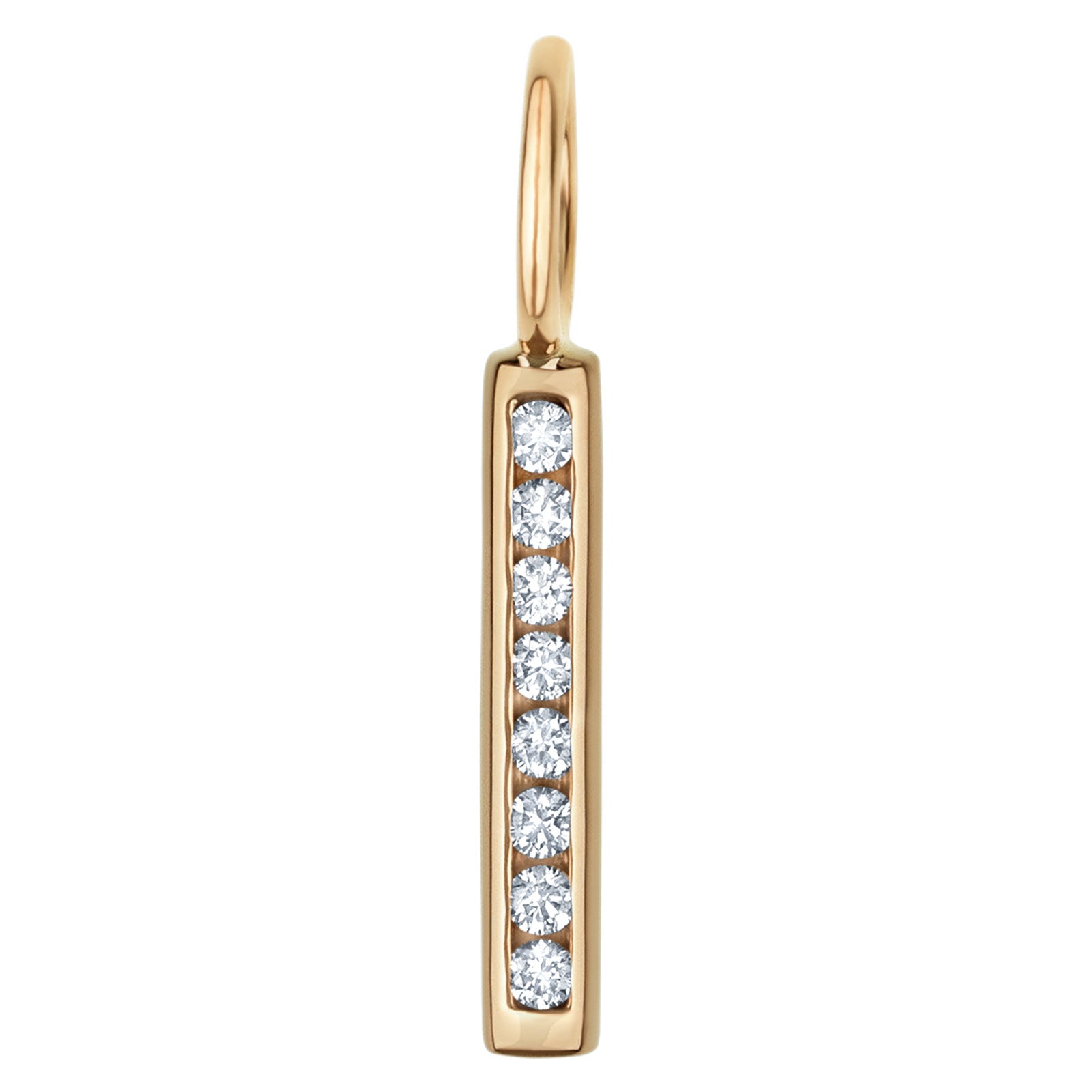 Small yellow gold channel set bar with white diamonds.