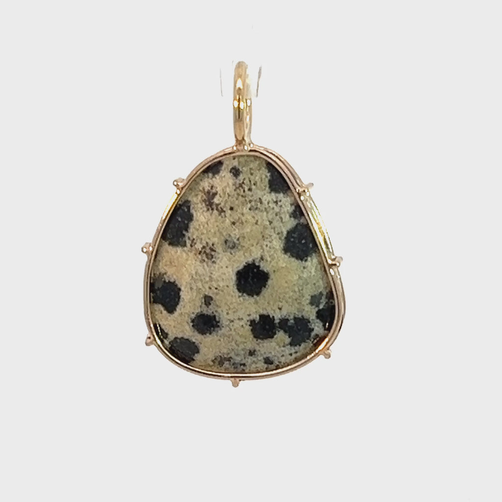 Small Dalmatian Jasper Harriet Stone wrapped in yellow gold wire. The stone shown is the stone you will receive. Each Harriet Stone is unique, and once this stone is sold there may not be another like it.