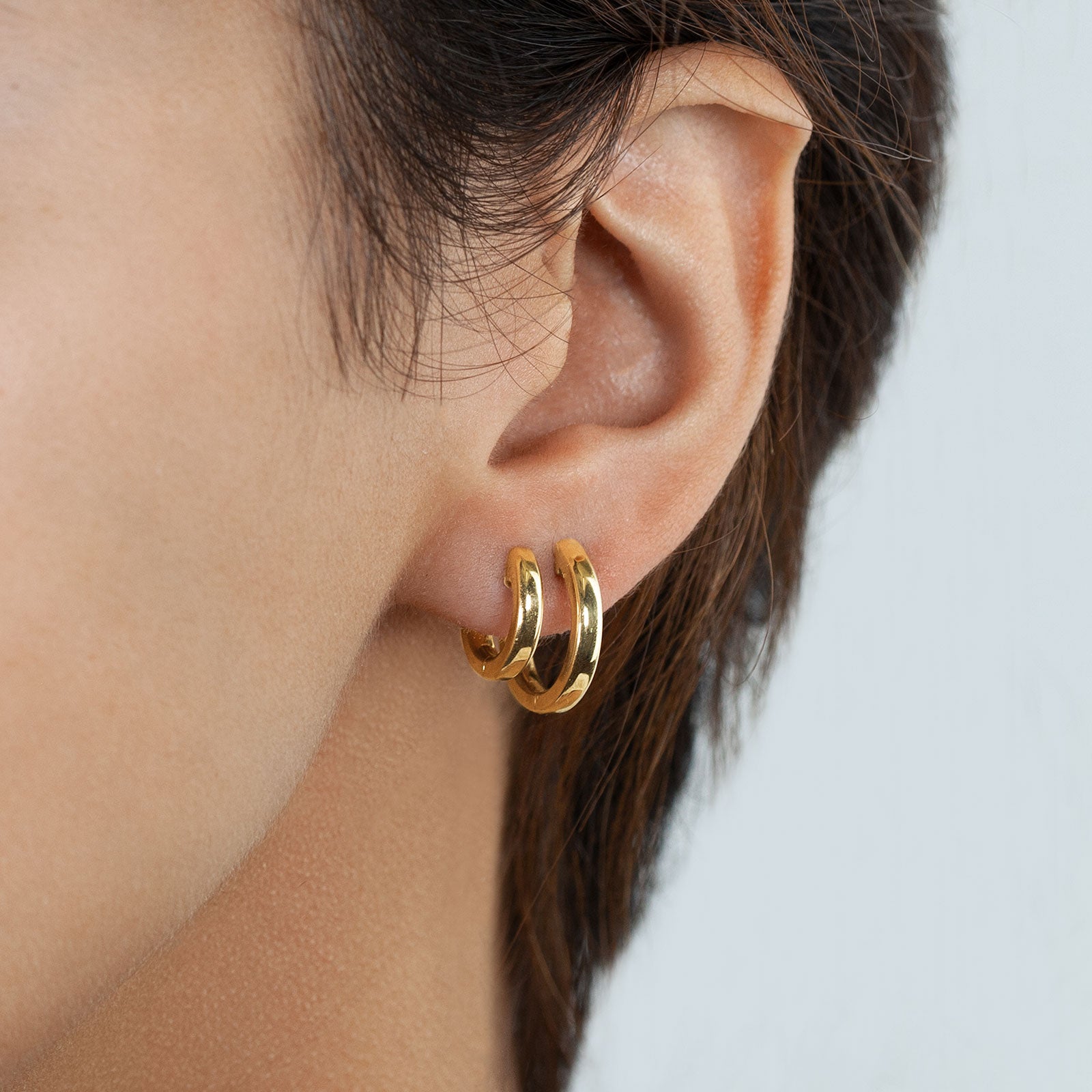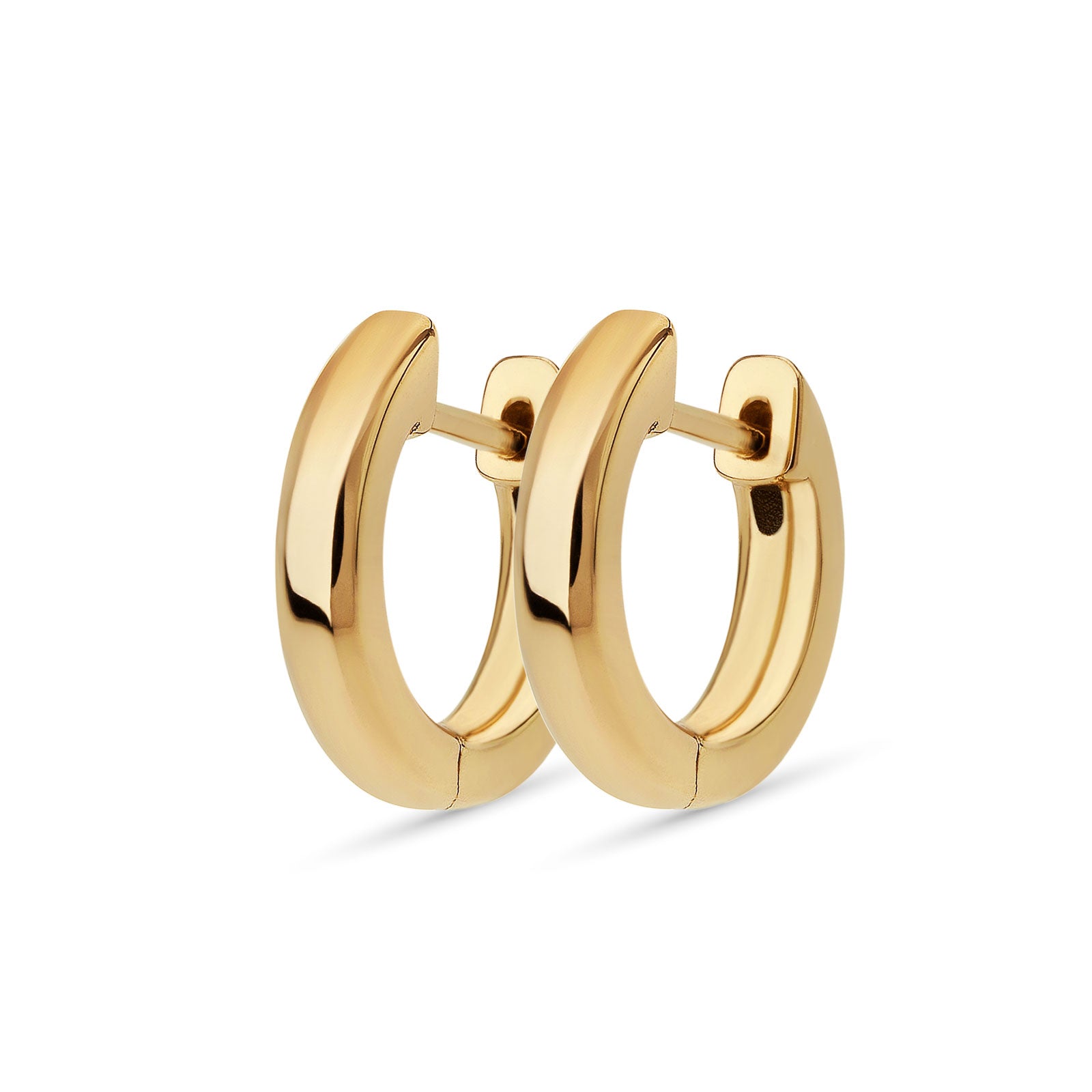 A pair of small yellow gold round huggie earrings that hug the earlobe with a simple open and close hinge. Our yellow gold is lead and nickel free.