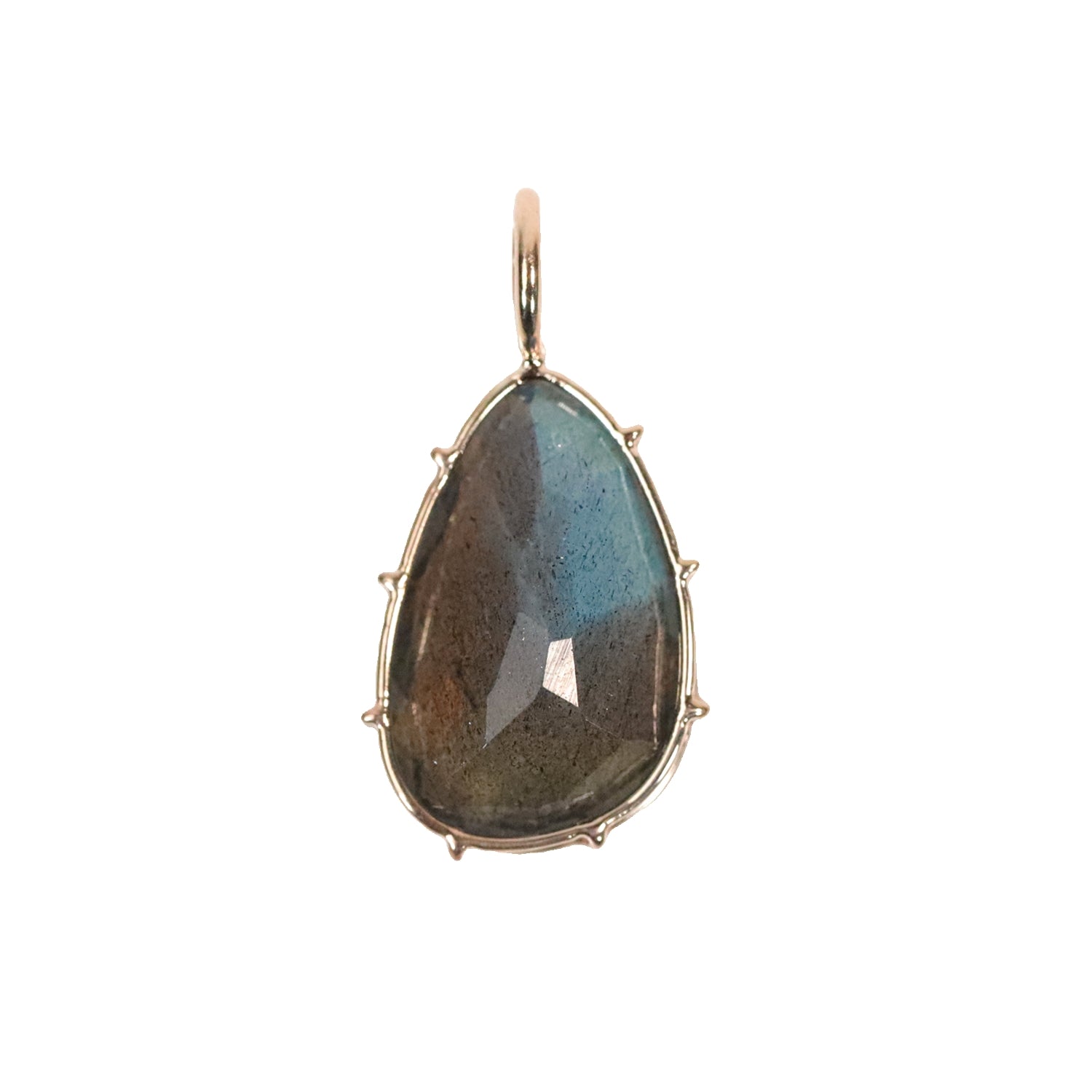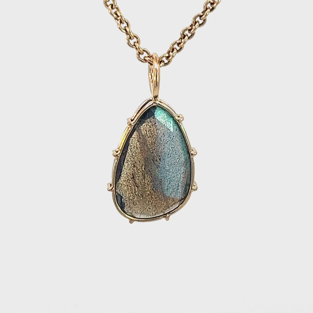 Small labradorite Harriet Stone wrapped in yellow gold wire. The stone shown is the stone you will receive. Each Harriet Stone is unique, and once this stone is sold there may not be another like it.