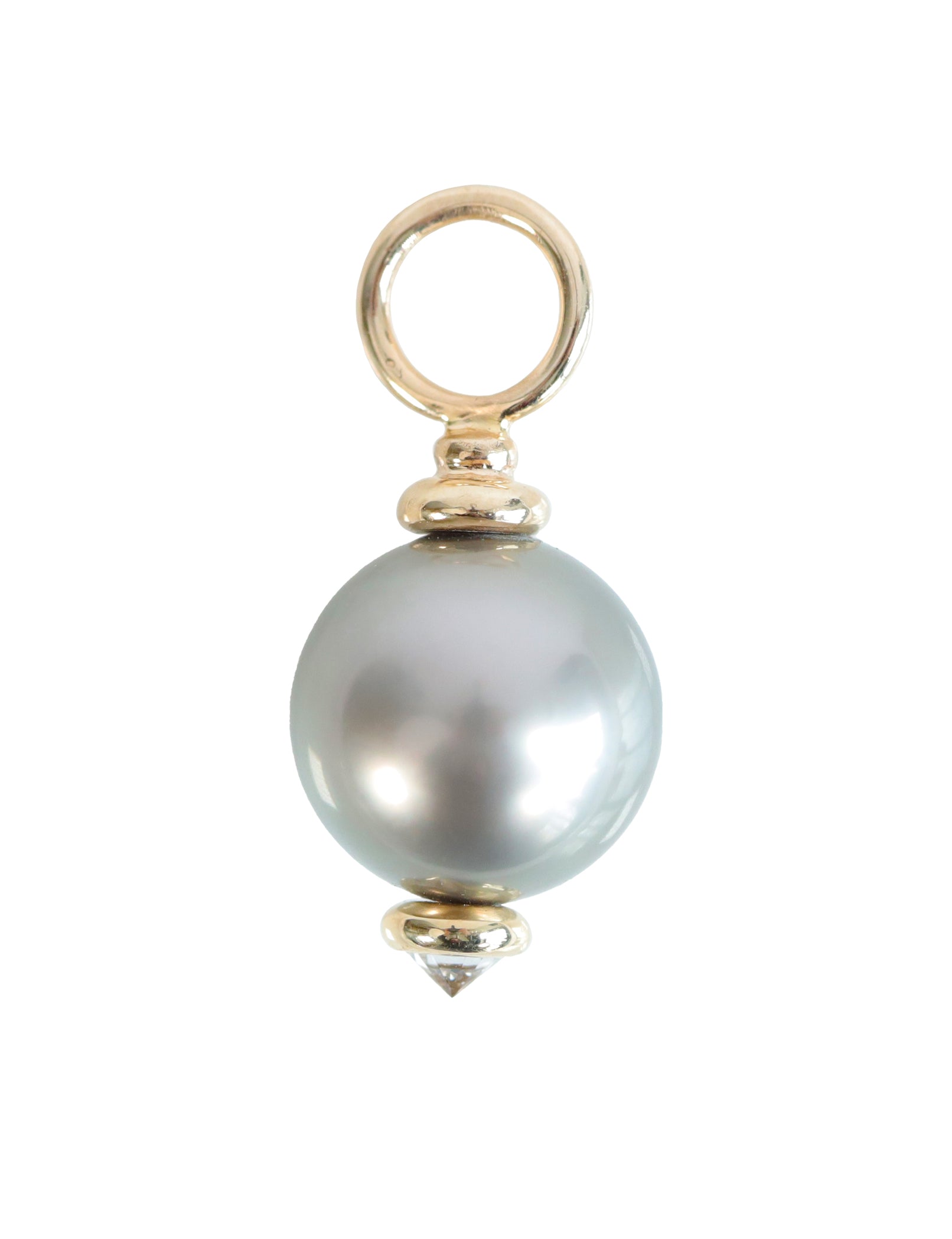 A Beautiful Tahitian pearl wired with 14k yellow gold wire, and accented with a 3mm diamond bezel at the bottom. This glamorous piece would make a perfect addition to any necklace.